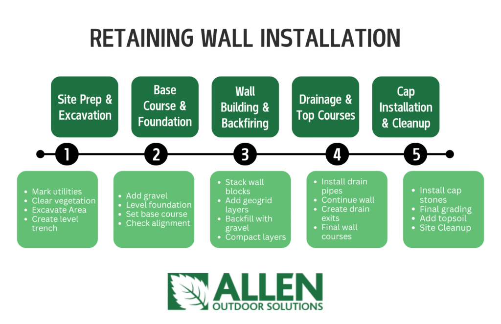 After marking utilities and preparing the site, we install a compacted gravel base, establish proper drainage, and begin wall construction using techniques appropriate for your chosen material. For taller walls, we incorporate geogrid reinforcement for added stability.